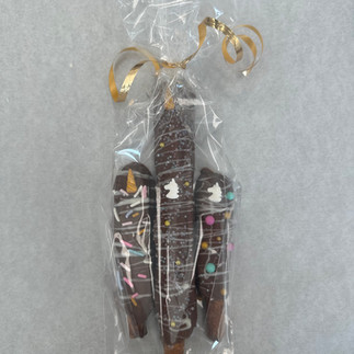 Then, let the rods fully dry and harden (this can be sped up by putting turn in the fridge). Once the chocolate is dull and matte in appearance, the rods are ready to package. Again, be careful. Not only do the rods break easily, but if you are too rough the sprinkles and chocolate may smear on the bad.